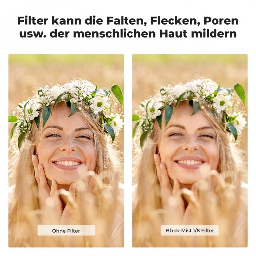 - * 【Kontrast Reduzieren】 Black Mist 1/8-Filter mit schwarzem Nebel kann die Falten, Sommersprossen und Poren der Gesichtshaut mildern und sie zarter, praller und wunderschöner machen. Der Nebeltraumeffekt kann besser realisiert werden und zeigt die Filmeffekte verträumt.