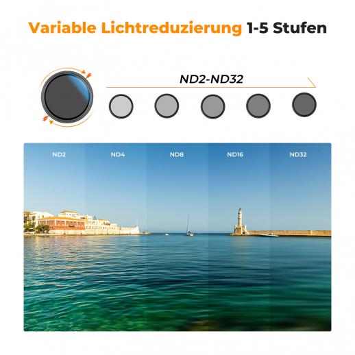 - * 【Filterfunktionen】 Mit dem variablen ND2-32 können Sie bei hellen Lichtverhältnissen fotografieren, um Bilder ohne Bewegungsunschärfe aufzunehmen. Während der Polarisator Reflexionen und Blendeffekte von glänzenden Objekten wie Wasser und Glas reduziert und so die Farbsättigung und den Kontrast in Bildern verbessert.