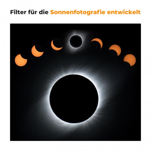 - * 【16,6-Stufen-Lichtreduzierung】K&F Concept ND100000 Solarfilter ist ein 16,6-Stufen-Lichtreduzierungs-Neutraldichtefilter, der hauptsächlich für Sonnenfotografie und Langzeitbelichtungen verwendet wird. Durch die präzise Lichtreduzierung trägt der Filter dazu bei, Farbtreue und scharfe Ergebnisse zu gewährleisten und Details der Sonne einzufangen.