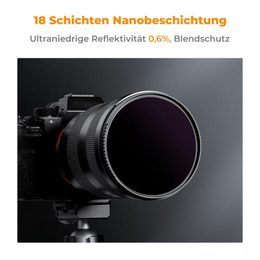 - * 【18-lagige Nano-Beschichtung】 Dieser solide Neutraldichtefilter ND100000 besteht aus hochwertigem optischem Glas mit einer 18-lagigen Nano-Beschichtung, die dazu beiträgt, die Reflexion der Filteroberfläche und Geisterbilder effektiv zu reduzieren und gleichzeitig den Filter kratzfest, wasserabweisend und ölabweisend zu machen und staubdicht.