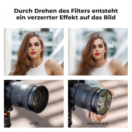 - * 【360° drehbarer Halo-Effekt】Mit seinem einfachen Schraubdesign lässt sich der Spiral-Halo-Filter leicht an Ihrem Kameraobjektiv anbringen. Er kann um 360 Grad gedreht werden, um den perfekten Halo-Effekt für Ihre Aufnahme zu erzielen und Ihrer Kreativität freien Lauf zu lassen.
