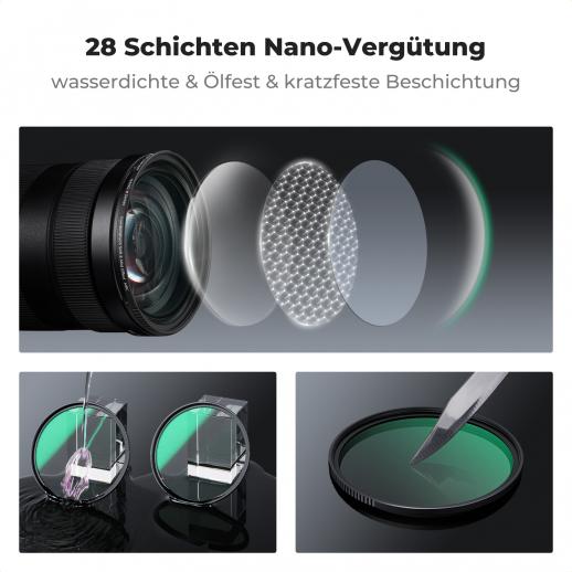 Dieser schlanke Filter ist, wie alle unsere K&F Concept-Filter, solide gebaut und besteht aus Metallrahmen aus Vollaluminiumlegierung mit gerändelten Kanten und optisch perfekt beschichteten Glaslinsen. Die 28-lagigen Nano-Linsenbeschichtungen variieren von Typ zu Typ, aber die ÄUSSERSTEN Schichten sind wasserdicht, kratzfest und leicht zu reinigen.
