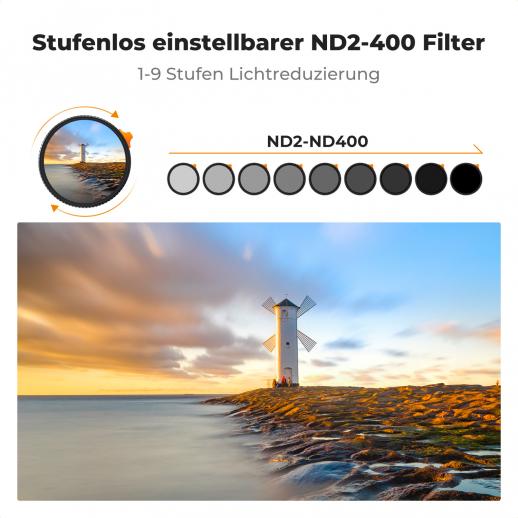 - * 【1-9 Blendenstufen】Variabler ND2-400 Filter ist für Langzeitbelichtungs- und Bewegungsunschärfetechniken bei wechselndem Licht vorgesehen. flexible Lichtreduktion von 1 bis 9 Blendenstufen,ohne die Farbbalance zu beeinflussen. Ideal für kreative Langzeitbelichtungen in der Landschaftsfotografie, dynamische Wasseraufnahmen und präzise Lichtkontrolle bei Videoaufnahmen.