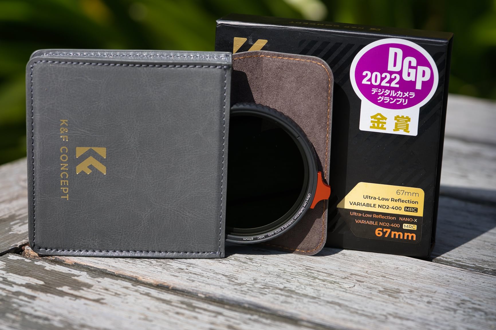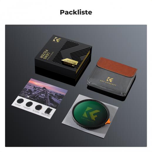 Ein weiterer hervorragender Filter von K&F, von der Verpackung bis zum Filter selbst. Verpackt in einer sicheren Box und dann in einer magnetischen Tragetasche in Lederoptik. Der Filter selbst hat ein sehr gut verarbeitetes Glas mit einem Metallgriff zum Einstellen des ND-Bereichs.