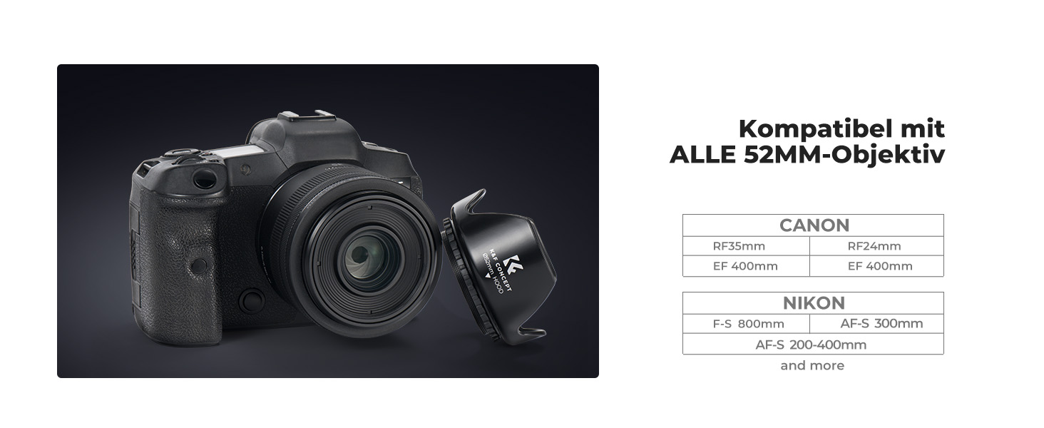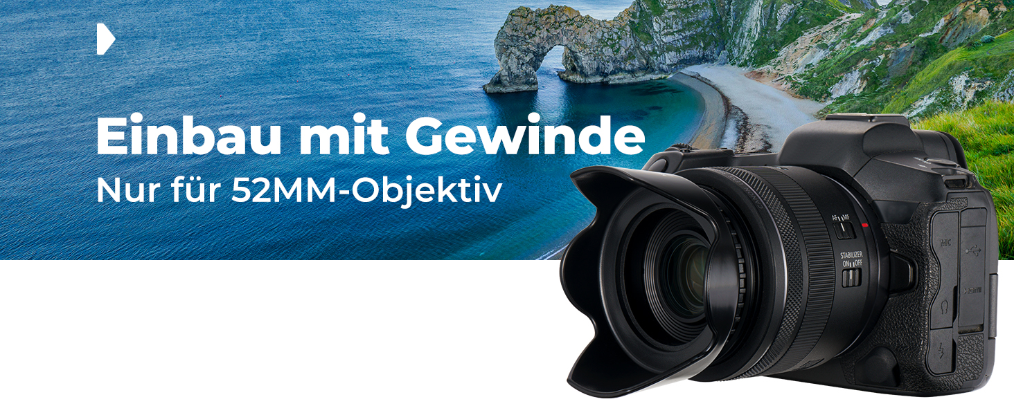 - * 【WICHTIG】Unsere Gegenlichtblende ist mit allen 52-mm-Objektiven kompatibel. Bitte überprüfen Sie vor der Bestellung die Objektivgewindegröße Ihrer Kamera. Die Größe des Objektivgewindes Ihrer Kamera ist irgendwo auf dem Objektivtubus markiert oder unter Ihrem Objektivdeckel aufgedruckt. Dieser Zahl ist immer ein „Ø“-Symbol (Durchmesser) vorangestellt. Zum Beispiel: Ø52 = 52 mm Objektivgewindegröße. Dies ist eine nicht umkehrbare Haube.