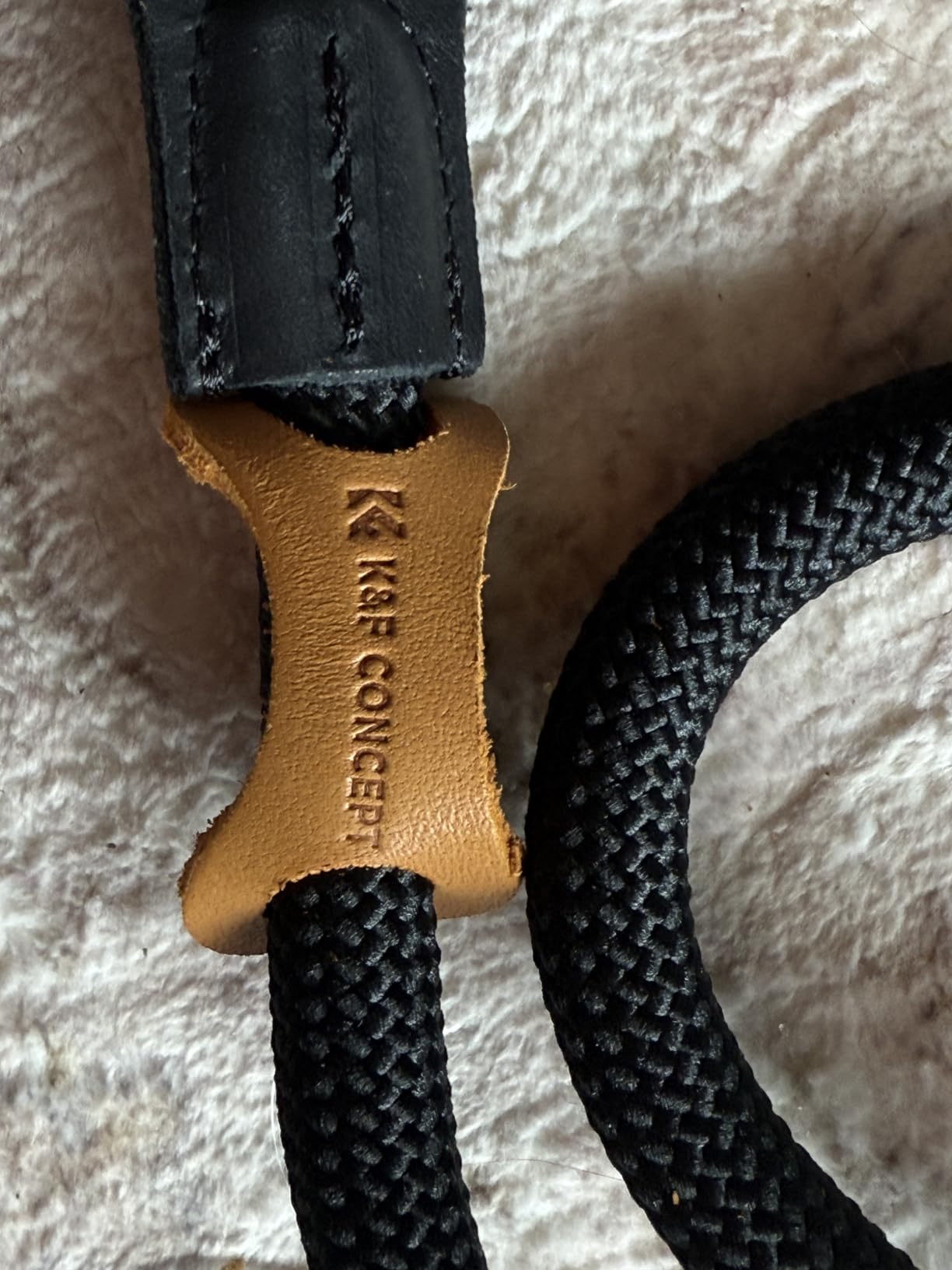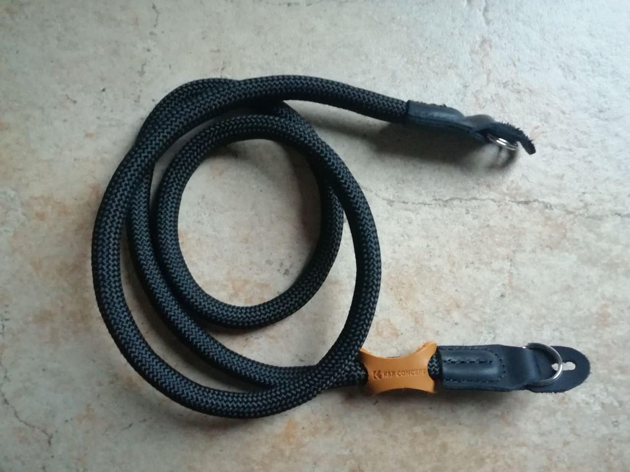 Dies ist ein Kamera-Halsband der Marke K&F, es ist ein geflochtenes Seil, dick (10 mm Durchmesser), aber weich, es ist 100 cm lang, an beiden Enden befinden sich ein Lederanschluss, ein Metallring und ein Schutz, um Metallverkratzen des Kameragehäuses zu vermeiden.
