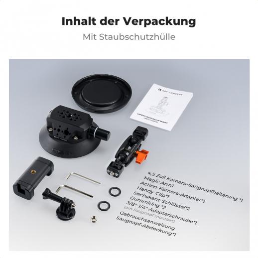 Saugnapfhalterung „de luxe“ von K&F Concetps in echt richtig hochwertiger Ausführung. Das Produkt kommt unglaublich gut verpackt und auf dem Saugnapf befindet sich sogar eine Schutzkappe um Staub und Schmutz fern zu halten. Des weiteren kommt im Lieferumfang auch eine Smartphone Halterung mit, damit auch mit dem Mobilgerät gefilmt werden kann. Generell ein tolles Produkt, welches ich nur empfehlen kann.