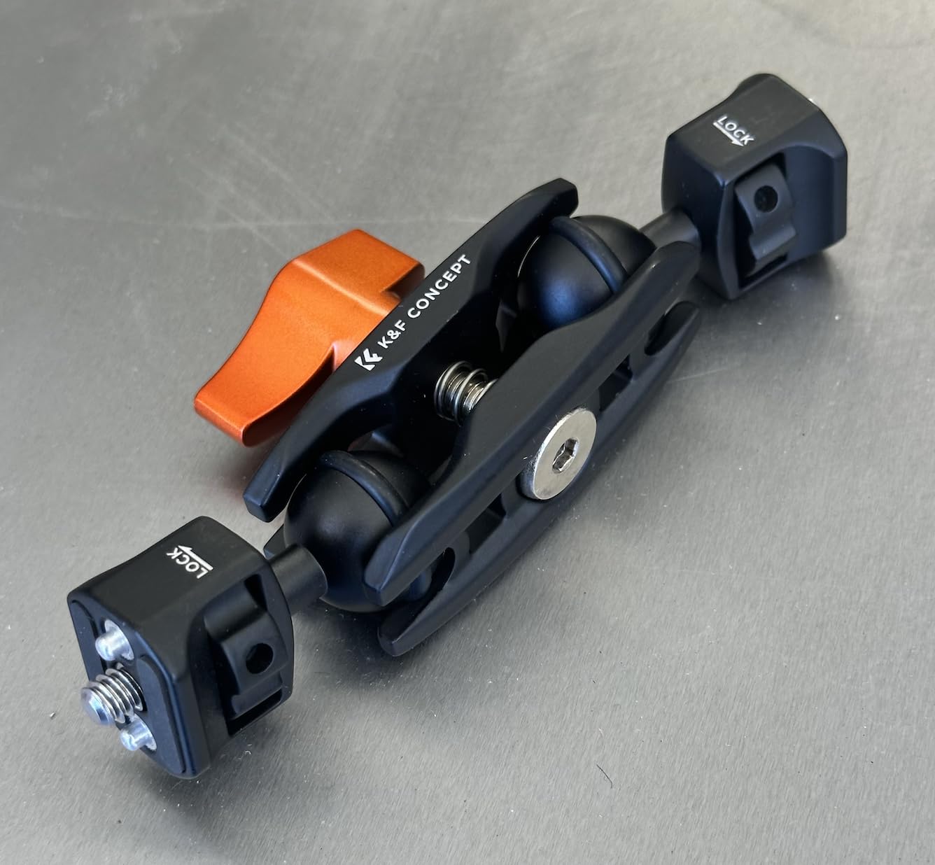 Der mitgelieferte Arm ist ziemlich klein, daher würde ich ihm keine komplette spiegellose Kamera anvertrauen. Für ein Telefon oder eine Action-Cam ist dieses Ding jedoch perfekt. Die Kugelköpfe haben Gummiringe, um die Reibung mit dem Einstellmechanismus zu erhöhen, wenn sie festgeklemmt werden. Das Ding geht nirgendwohin, wenn du alles festgezogen hast.