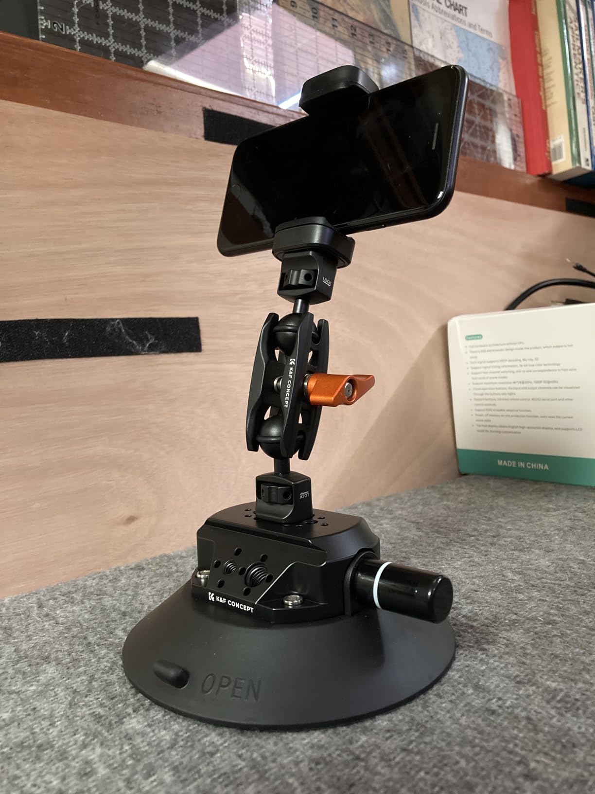 Es hat jedes Gerät, das ich darauf geworfen habe, sicher getragen, von schwereren Kameras bis hin zu Telefonen — kein Wackeln, kein Verrutschen. Die Verarbeitungsqualität fühlt sich erstklassig an, und der Saugnapf ist eindeutig so konzipiert, dass er sowohl vertikalen als auch horizontalen Belastungen mühelos standhält (bis zu 3 kg!).