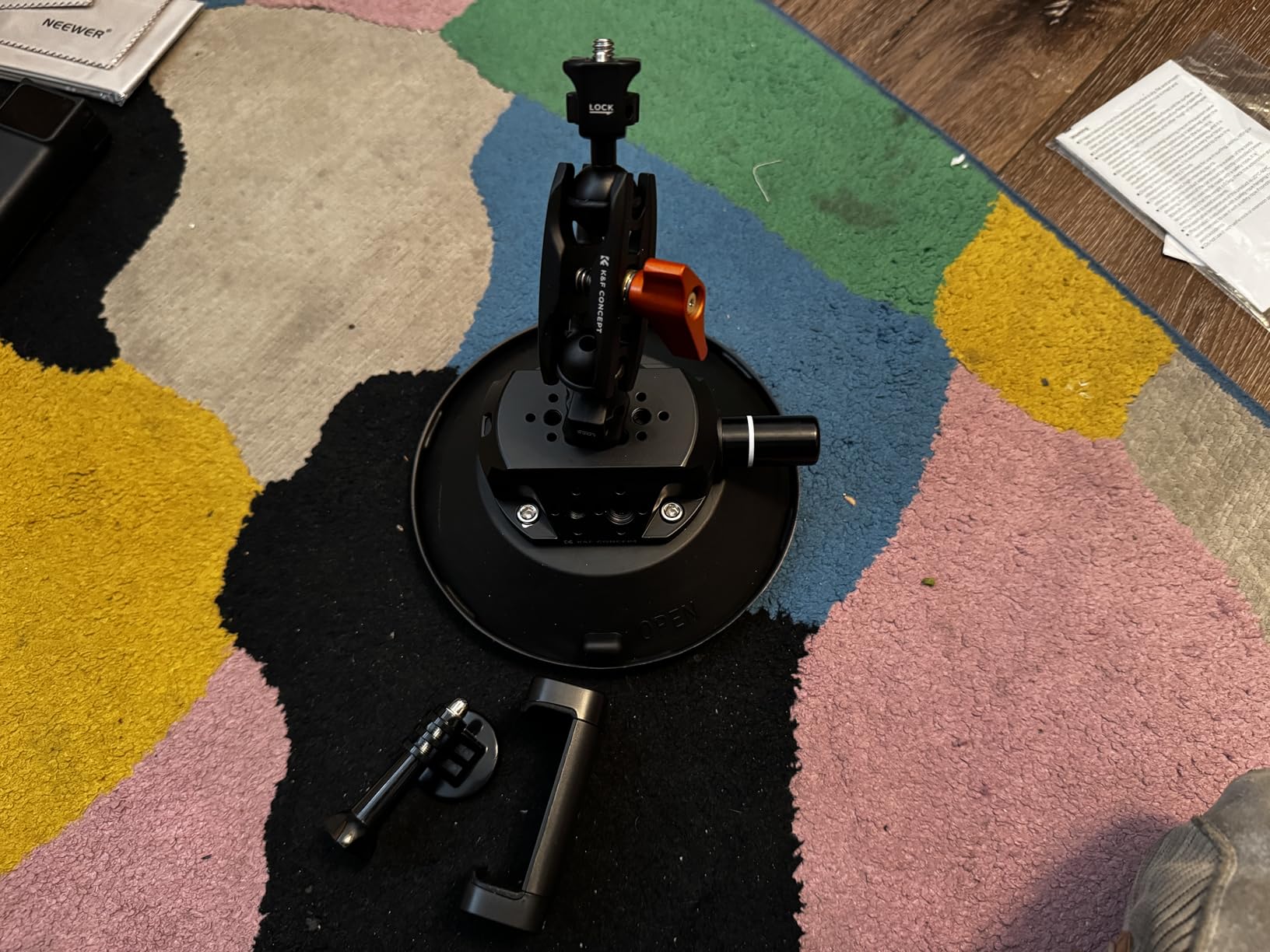 Die am Saugnapf montierte „Käseplatte“ bietet viele Befestigungsmöglichkeiten, aber der mitgelieferte Zauberarm gefällt mir sehr gut. Er hält fest und hat Sicherungsstifte. Nett...