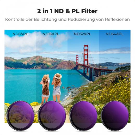 - * 【Hybrid ND&PL-Filter 2-in-1】Ein Filter kombiniert die Eigenschaften von ND- und CPL-Filtern. Die ND8/PL, ND16/PL, ND32/PL und ND64/PL bieten eine individuelle Lichtreduzierung von 3, 4, 5 und 6 Blendenstufen, helfen bei der präzisen Belichtungssteuerung unter verschiedenen Lichtverhältnissen und vermeiden unerwünschte Reflexionen von nichtmetallischen Oberflächen wie Wasser, Glas usw. und tragen zur Erhöhung des Kontrasts und der Sättigung bei blauem Himmel und weißen Wolken bei.