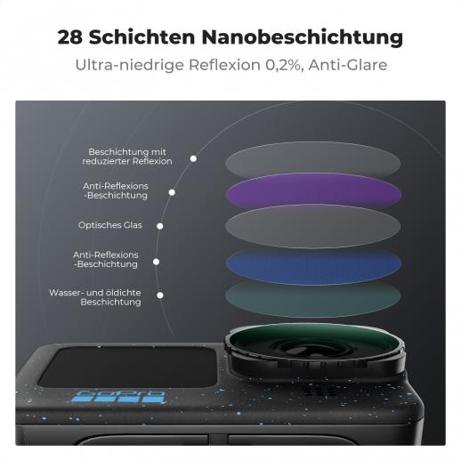 - * 【28 Mehrschichtige Beschichtungen】 Mehrschichtige Filter reduzieren Blendung und Streulicht, sind wasserdicht, kratzfest, staubdicht und ölbeständig und schützen das Objektiv Ihrer Action-Kamera von allen Seiten