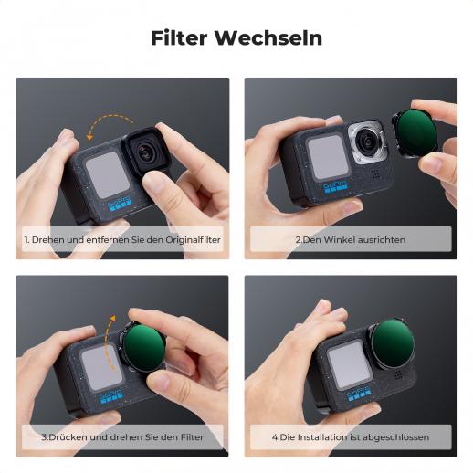 - * 【Einfach zu verwenden】 Drehen und schrauben Sie den Originalfilter ab, richten Sie dann den Winkel aus und drehen Sie den Filter, nachdem die Schnalle eingehakt ist. Dieses Filter-Kit hilft, kristallklare Bilder und Videos effizient beim Laufen, Klettern, Radfahren, Fallschirmspringen, etc. zu erhalten
