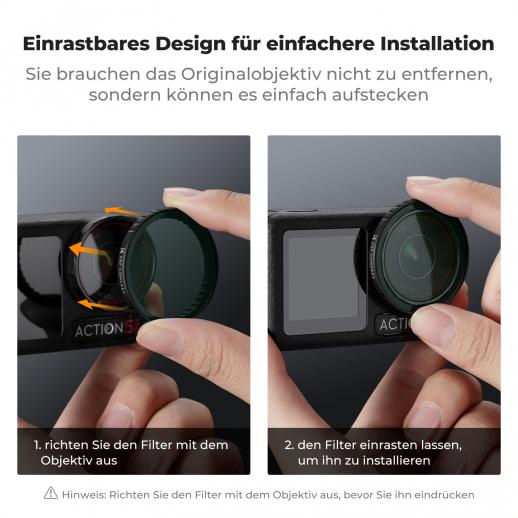 Ich möchte meine vorherige Einschätzung korrigieren. Der erste Filter, den ich für den DJI Osmo Action 5 Pro erhalten habe, funktionierte nicht richtig, aber der Verkäufer hat sehr professionell reagiert und mir einen weiteren Filter ohne zusätzliche Kosten geschickt.